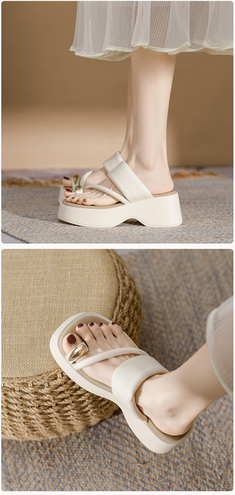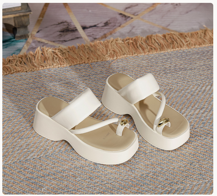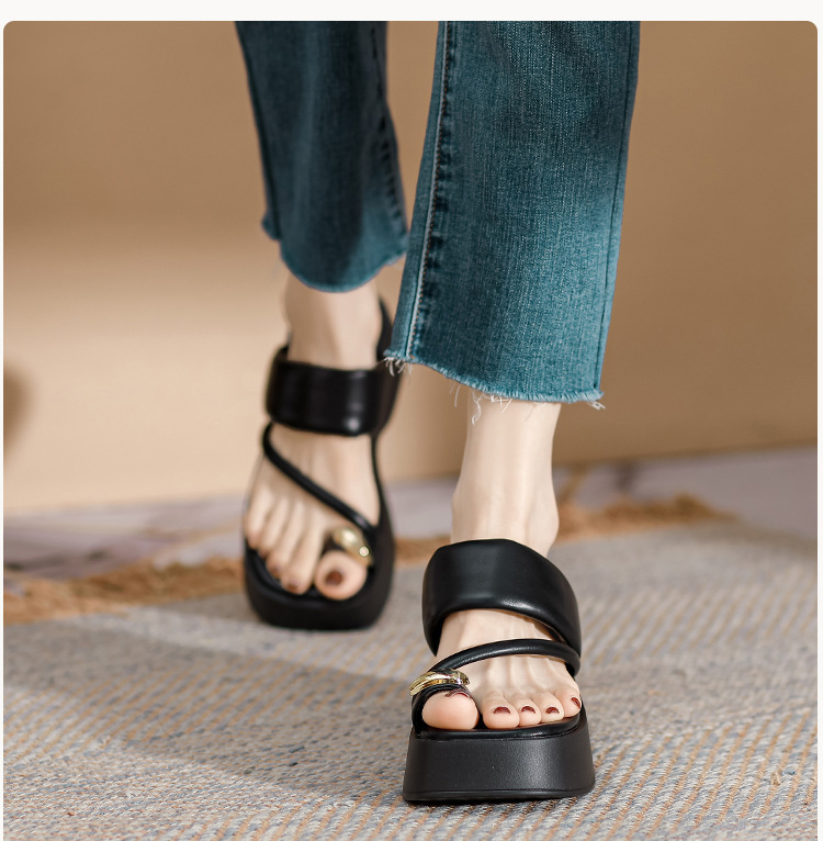 비치에서 착용한 여성 키높이 샌들
