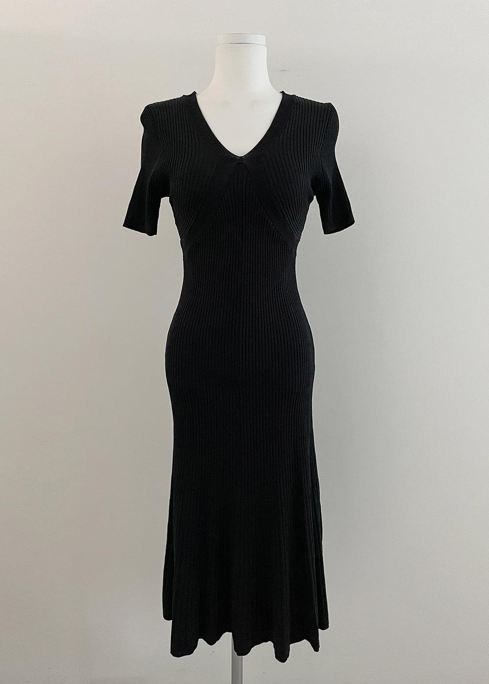 반팔 슬림 미디스커트 솔리드 니트 브이넥 풀오버 원피스